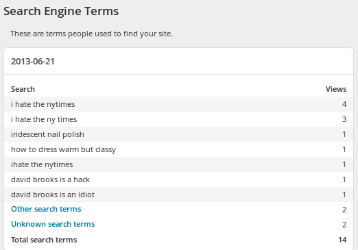 Everyone always makes such a big deal about search engine optimization, but I don’t see anything impressive about it.  Search engine optimization is easy.  For instance, let’s say you’re a blogger, and you have a target audience who is interested in a variety of topics, such as “David Brooks idiot,” “David Brooks stupid,” “David Brooks hack,” “David Brooks asshole,” “David Brooks dickhead,” “David Brooks imbecile,” “David Brooks sucks,” “David Brooks wack,”  “worst David Brooks,” “David Brooks waste of organic matter,”  and “fire David Brooks.”  Just create blog posts about those topics, using those words, and internet success will be yours!